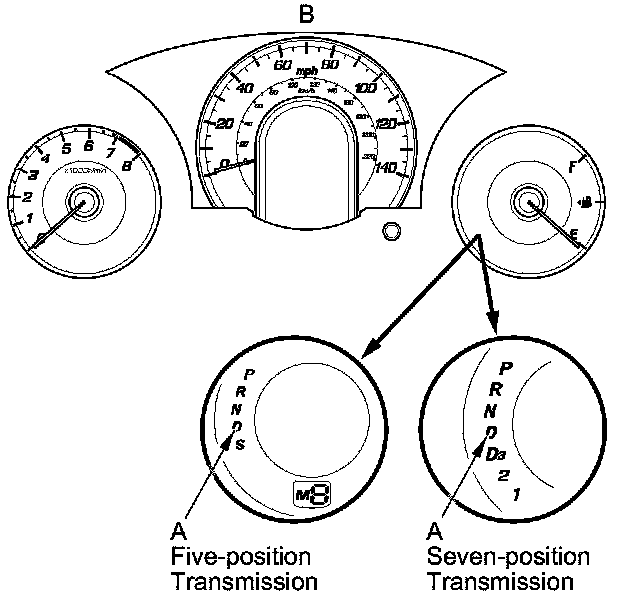 When the powertrain control module (PCM) senses an abnormality in the input or output system, the D indicator (A) in the gauge control module (B) will usually blink.