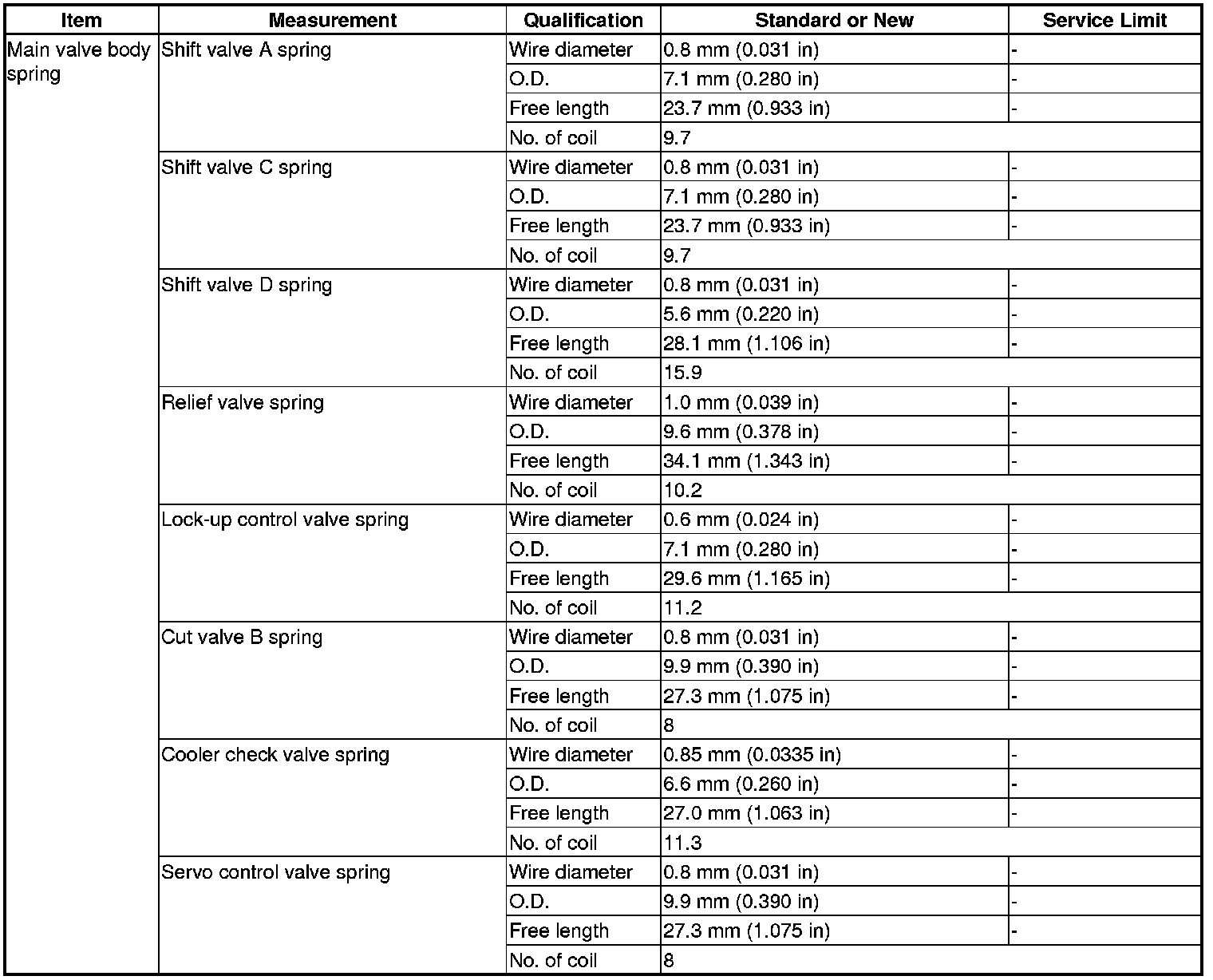 Main Valve Body spring Specification(s) (A/T)