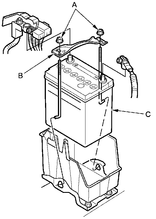 2. Remove the two nuts (A) securing the battery setting plate (B), then remove the battery setting plate and the battery (C).