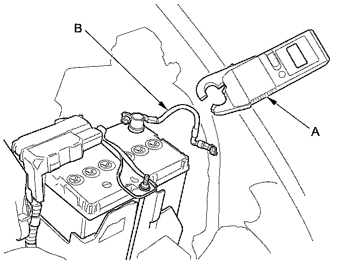 11. Attach the LH41 AC/DC low current clamp meter (A) to the battery ground cable (B) following the equipment manufacturer's instructions, then measure the parasitic draw.