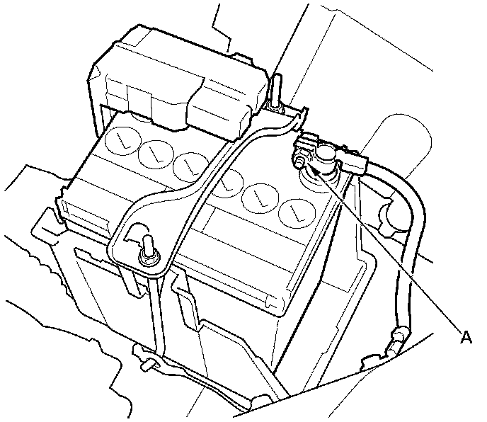 14. Loosen the nut (A) from the battery negative terminal.