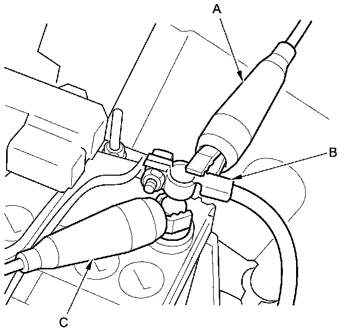 16. With the red (+) test lead (A) attached, slide the negative terminal (B) of the battery ground cable upwards from the battery negative terminal post to avoid misconnection. Then connect the black (-) test lead (C) to the battery negative terminal post.