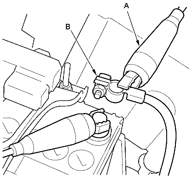 17. With the red (+) test lead (A) still attached, completely disconnect the negative terminal (B) of the battery ground cable from the battery negative terminal.