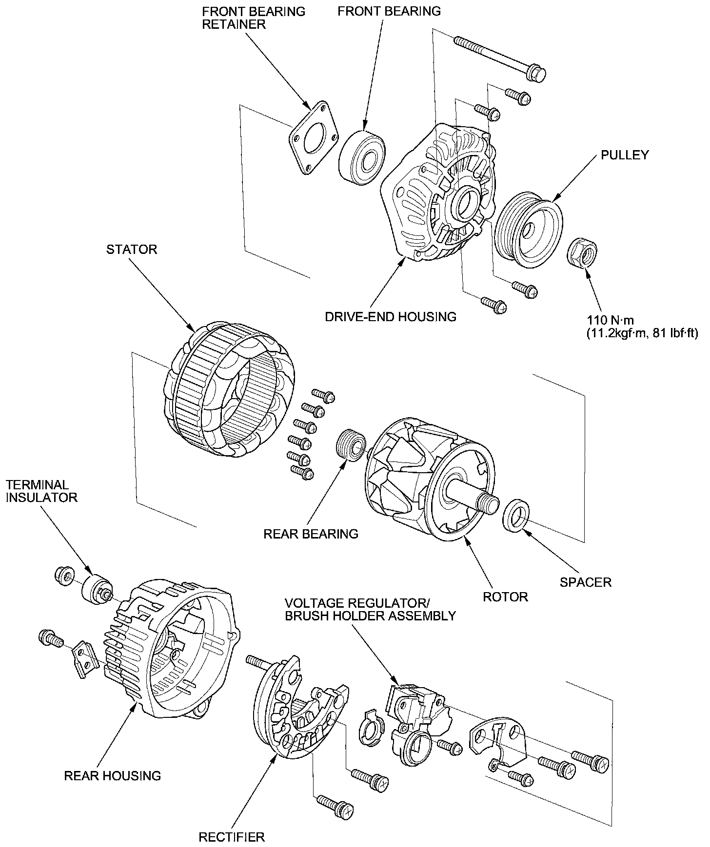 25. If you removed the pulley, put the rotor in the drive-end housing, then torque its locknut to 110 Nm (11.2 kg-m, 81 lb-ft).