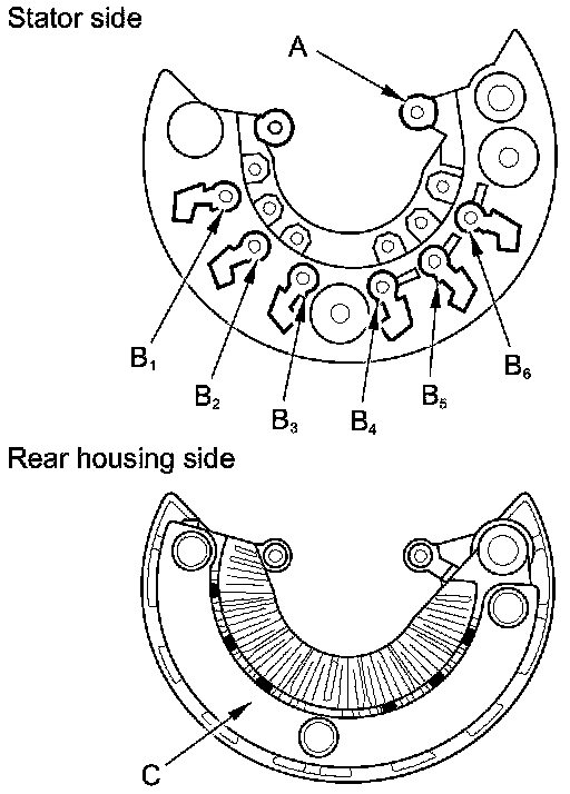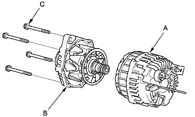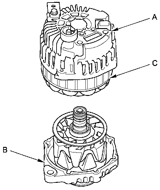 6. Separate the rear housing (A) and the drive-end housing (B) with the stator (C) attached to the rear housing.