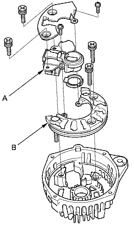 17. Remove the voltage regulator/brush holder assembly (A) and the rectifier (B).