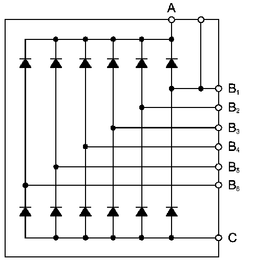 18. Check for continuity in each direction, between the B terminal (A) and P terminals (B), and between the E terminal (C) and P terminals (B) of each diode pair. All diodes should have continuity in only one direction. Because the rectifier diodes are designed to allow current to pass in one direction, and the rectifier is made up of six diodes (six pairs), you must test each diode in both directions for continuity with an ohmmeter that has diode checking capability: a total of 24 checks.
