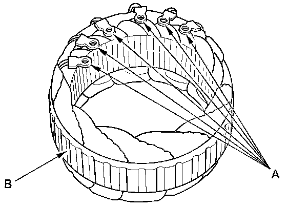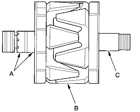 22. Check for continuity between each slip ring and the rotor (B) and the rotor shaft (C).
