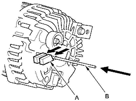 29. Push the brushes (A) in, then insert a pin or drill bit (B) (about 1.8 mm (5/64 in) diameter) to hold them there.