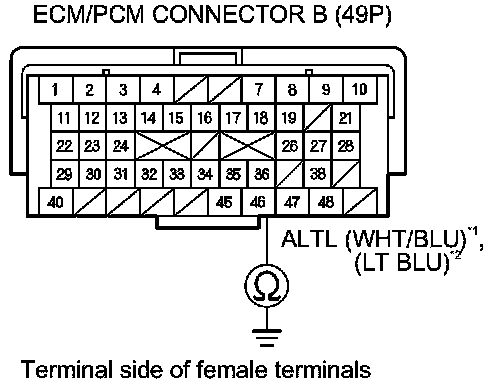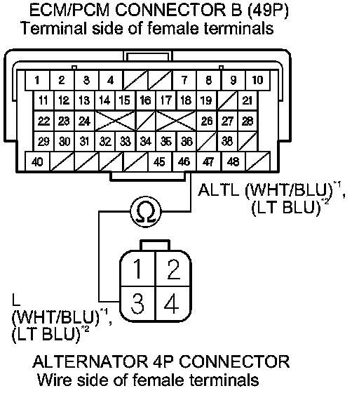 25. Check for continuity between ECM/PCM connector terminal B46 and alternator 4P connector terminal No. 3.