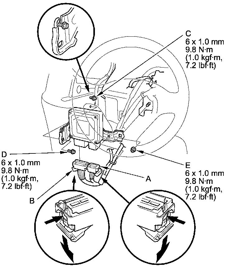 5. Remove the bolt (D) and nut (E) from the EPS control unit bracket.