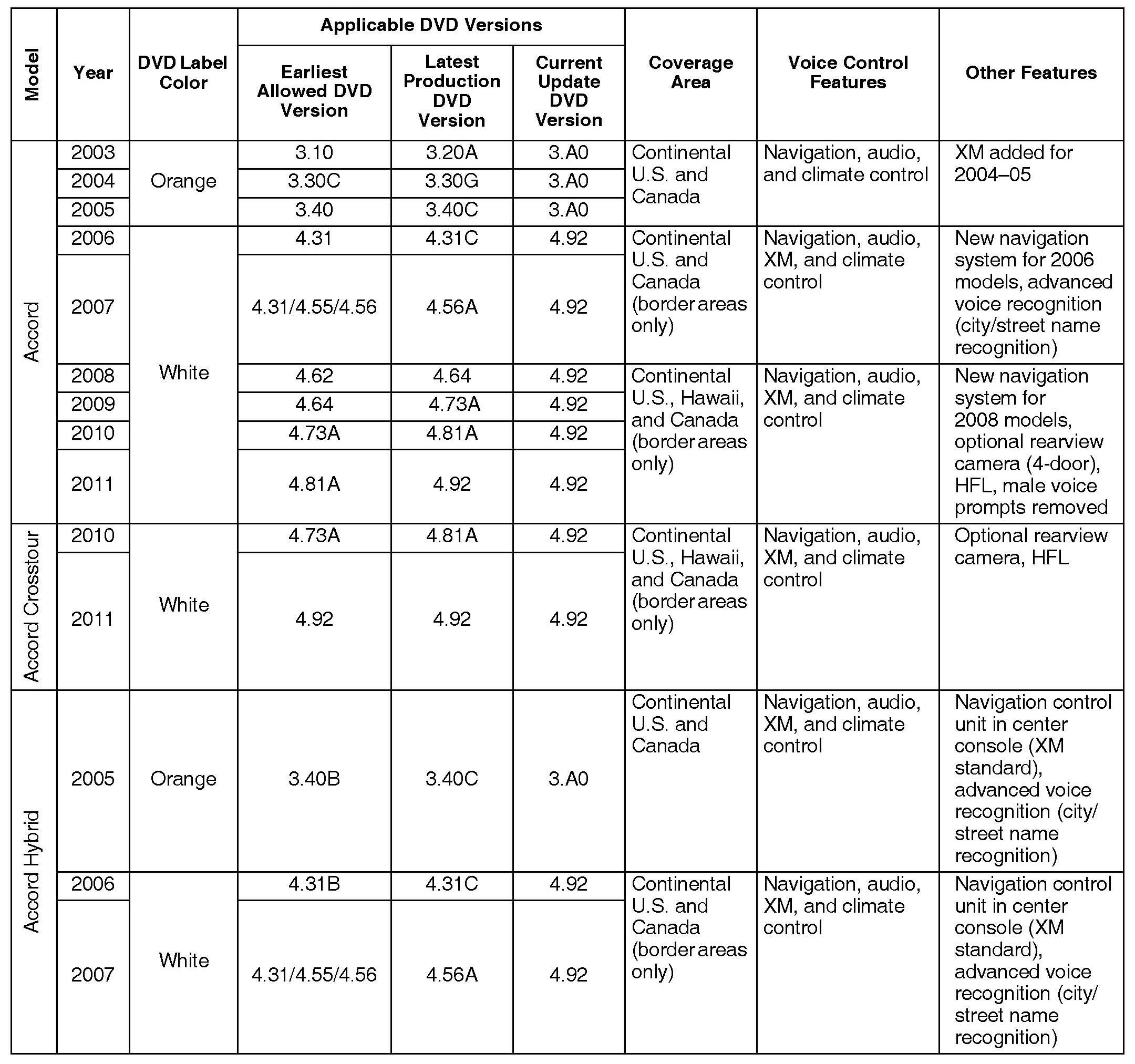 Each navigation system DVD contains a map/POI (point of interest) database and the navigation system software for each model that it supports. Inserting an older DVD (such as an earlier version than indicated in the table) can cause problems since it lacks the software to provide the specific features needed for that model. Unfortunately, the navigation software may not detect or warn you that the version is outdated, and it may even appear to operate normally.