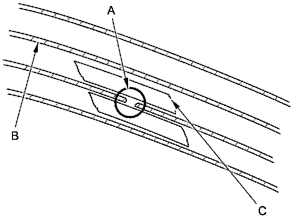 2. Carefully mask above and below the broken portion of the defogger wire (B) with cellophane tape (C).