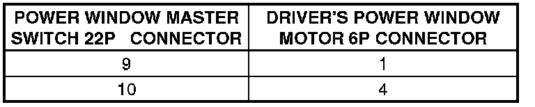 6. Check for continuity between power window master switch 22P connector terminals No. 9 and No. 10 and driver's power window motor 6P connector terminals No. 1 and No. 4 respectively. There should be continuity.