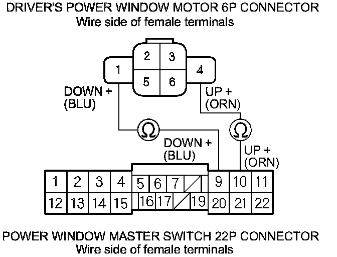 2. Test the motor in each direction by connecting battery power and ground to the power window master switch 22P connector (A) according to the table.