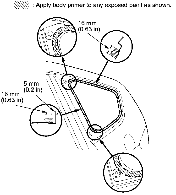 13. Apply a light coat of body primer to any exposed paint or metal around the flange where new adhesive will be applied. Let the body primer dry for at least 10 minutes: