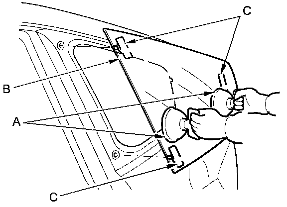 16. Use suction cups (A) to hold the quarter glass (B) over the opening, align it with the clips (C) and set it down on the adhesive. Lightly push on the quarter glass until its edges are fully seated on the adhesive all the way around.
