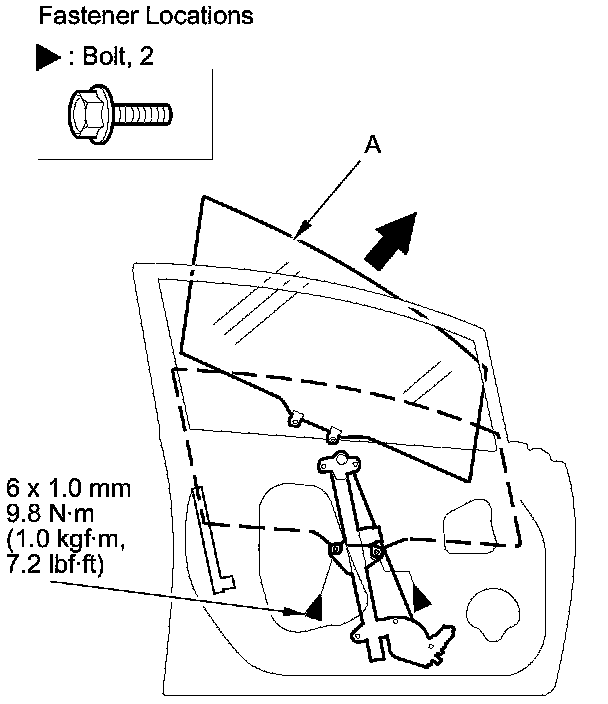 4. Carefully raise the glass (A) until you can see the bolts, then remove them. Carefully pull the glass out through the window slot.
