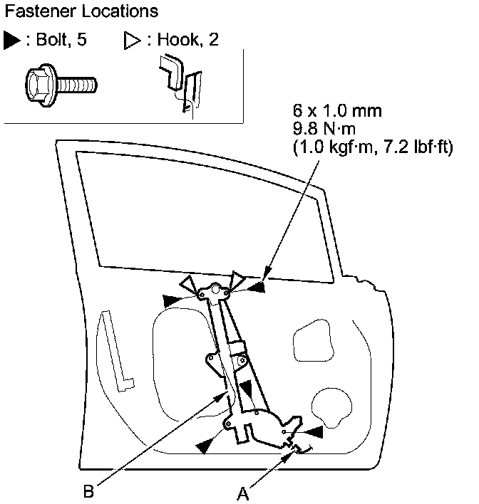 6. Remove the bolts, and release the hooks, then remove the regulator through the hole in the door.