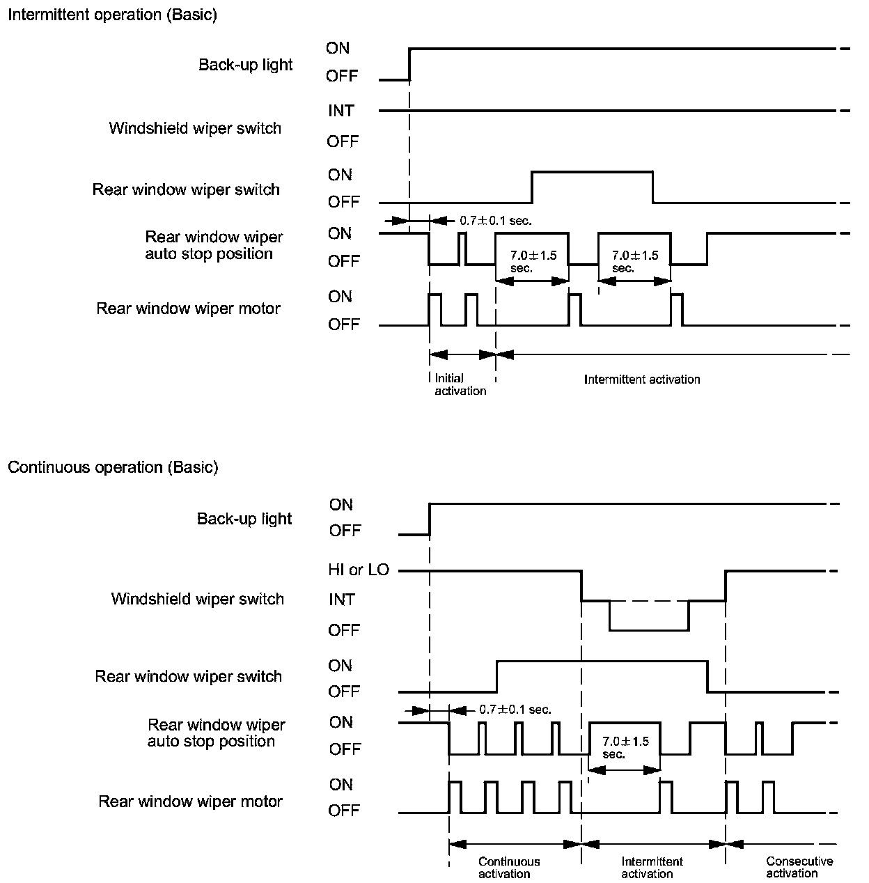 When the shift lever is shifted to R with the windshield wiper activated, the rear window wiper operates automatically even if the rear window wiper switch is off.