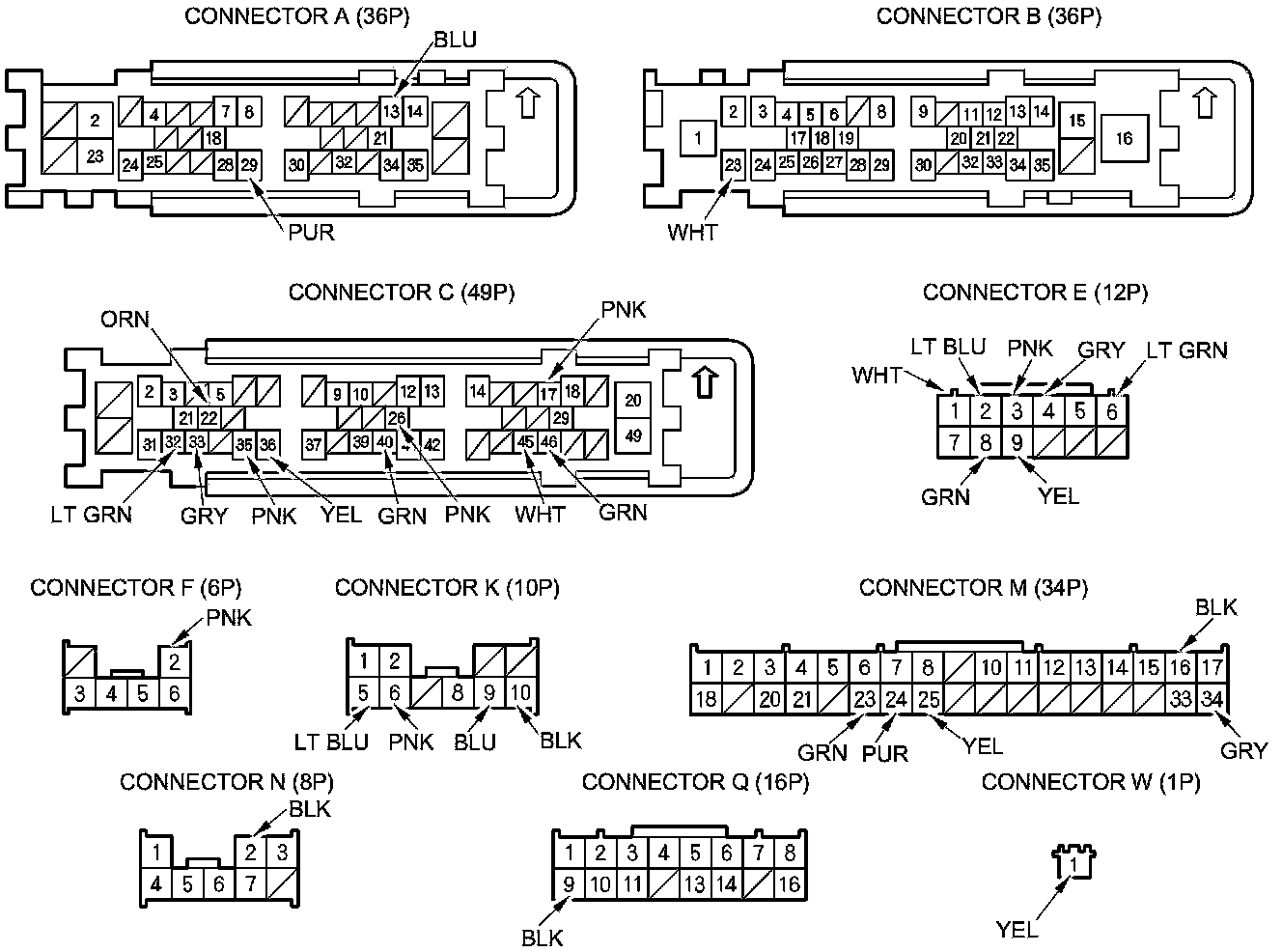 3. Disconnect under-dash fuse/relay box connectors A, B, C, E, F, K, M, N, Q, and W.