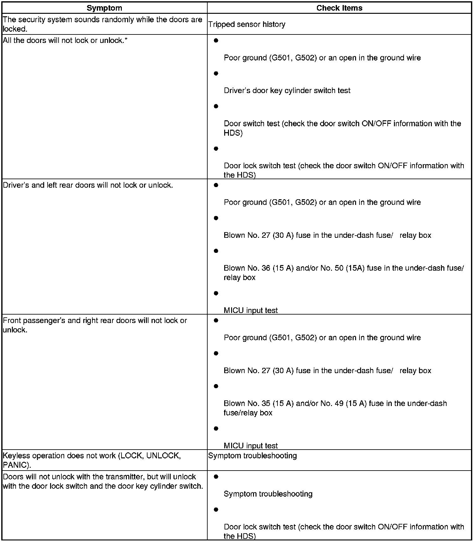 Keyless/Power Door Locks/Security System Symptom Troubleshooting Index