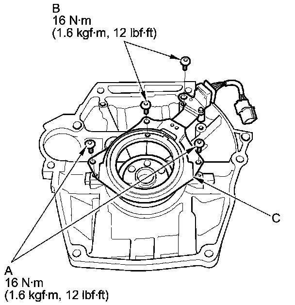 2. Remove the bolts (A, B) and the IMA motor rotor position sensor (C).