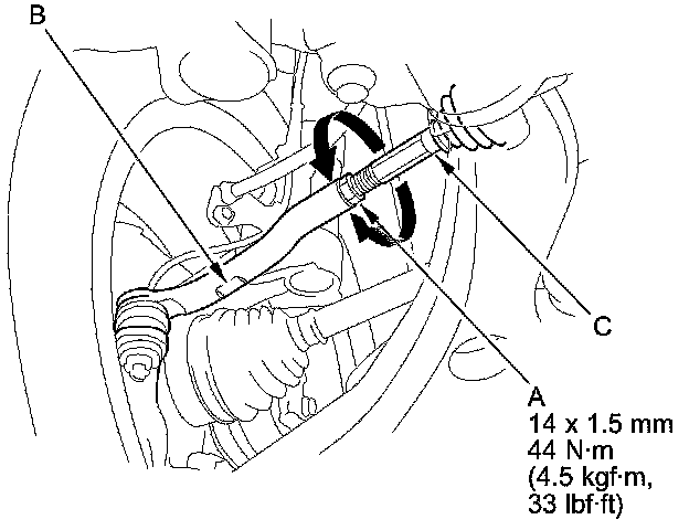 3. Loosen the tie-rod locknuts (A) while holding the flat surface sections (B) of the tie-rod end with a wrench, and turn both tie-rods (C) until the front toe is within specifications.
