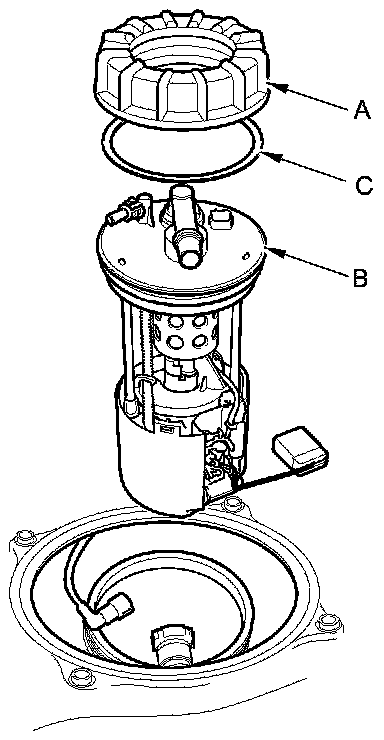7. Remove the locknut (A), the fuel tank unit (B), and the locknut plate (C).