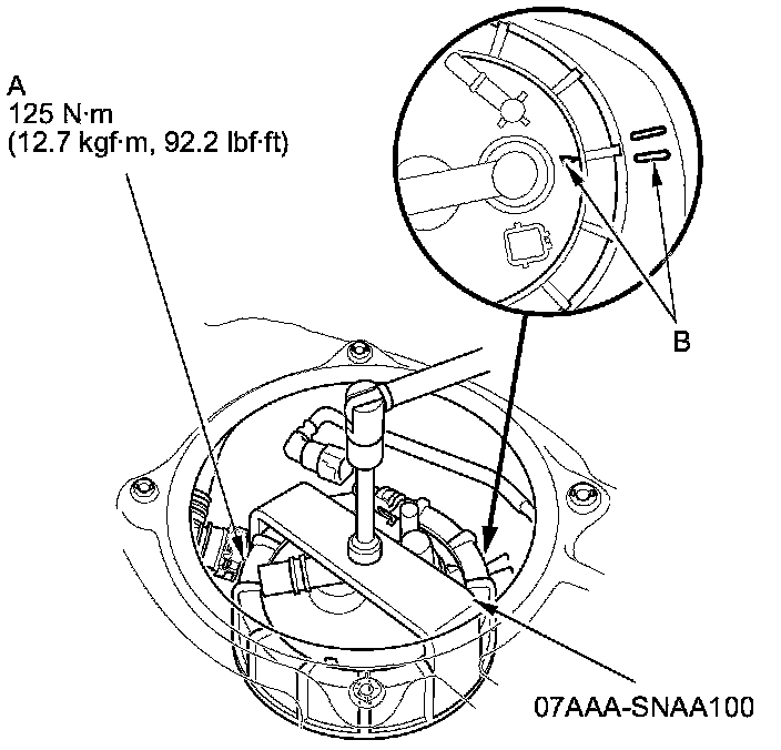 4. Using the special tool, tighten a new locknut (A) with a new locknut plate (B) to the specified torque.