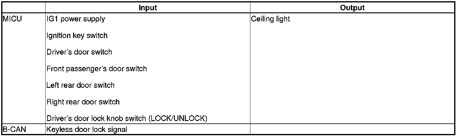 The MICU control of the ceiling light is based on inputs from each switch and B-CAN data.