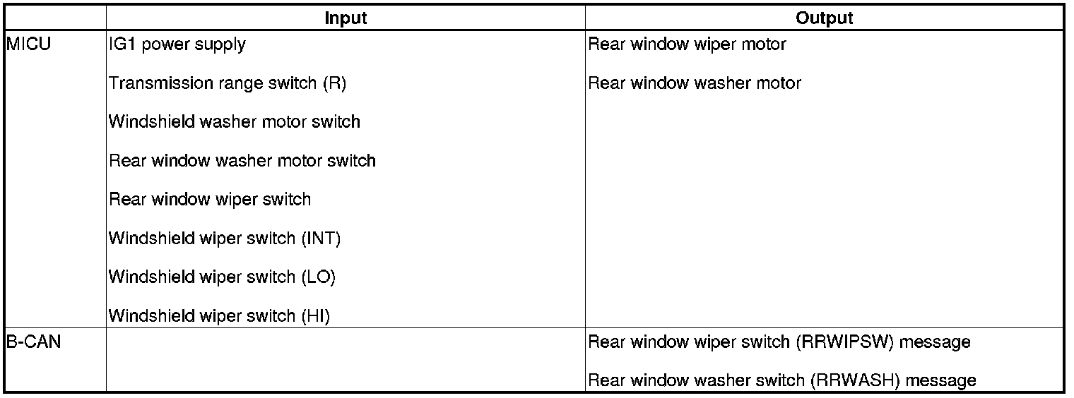 The MICU control of the rear window wiper motor and the rear washer motor is based on inputs from each switch.