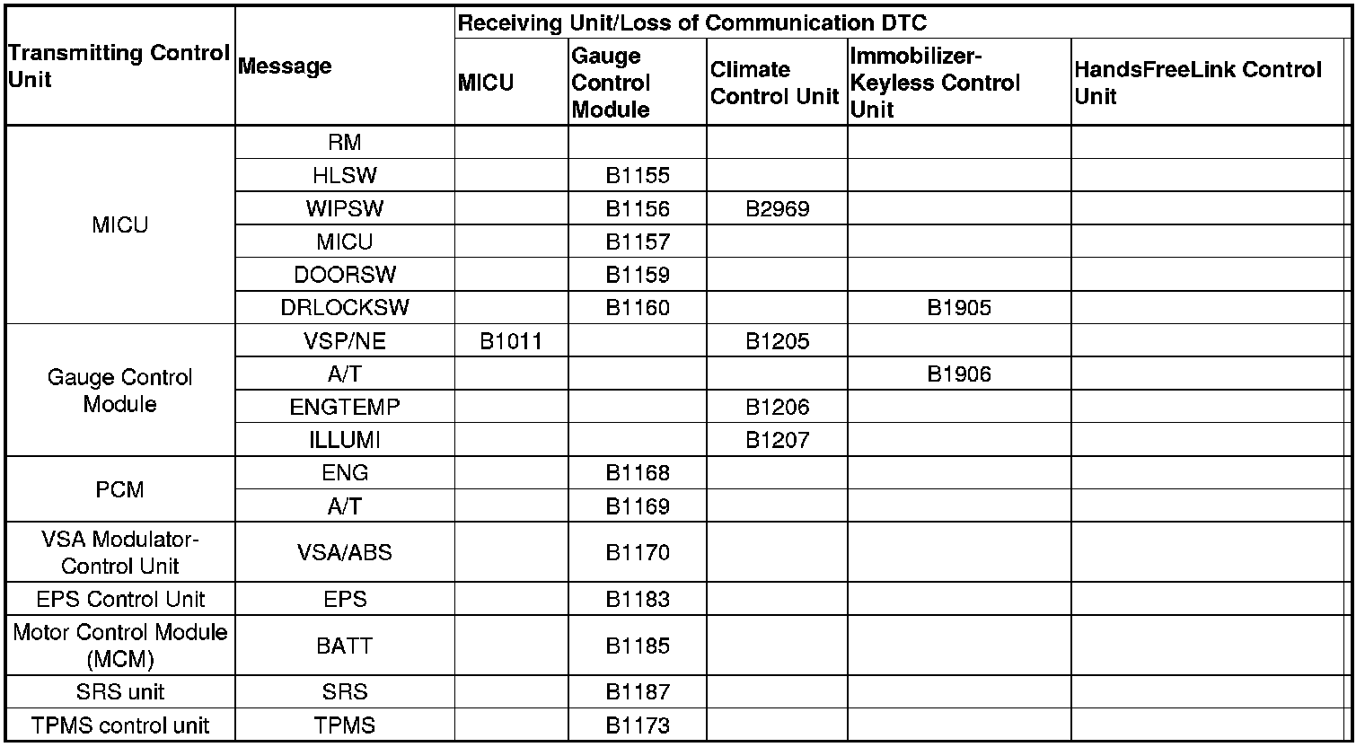When an ECU on the CAN circuit is unable to communicate with the other ECUs on the B-CAN and F-CAN circuits, the other control units will set loss of communication DTCs. Use this chart to find the control unit that is not communicating with the other control units on the CAN circuit.