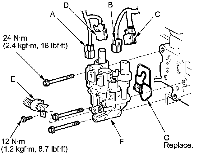 6. Install the valve in the reverse order of removal with a new rocker arm oil control valve filter (G).