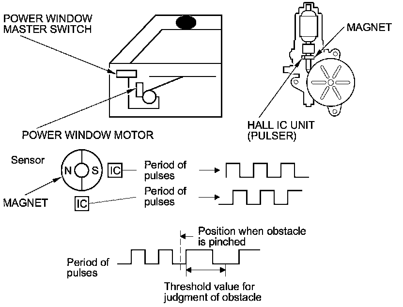 The driver's power window motor incorporates a Hall IC unit (pulser) which generates pulses during the motor's operation and sends pulses to the driver's power window control unit. As soon as the power window control unit detects a change in pulse frequency from the Hall IC unit (pulser), the driver's power window control unit makes the power window motor stop and reverse. If the window is more than halfway closed, it will reverse to the half open position. If the window is less than halfway closed, it will stop and reverse about 70 mm (2.8 in). This is to prevent pinching an obstacle during AUTO UP operation. The auto reverse operation is not active when the switch is held in the up position.