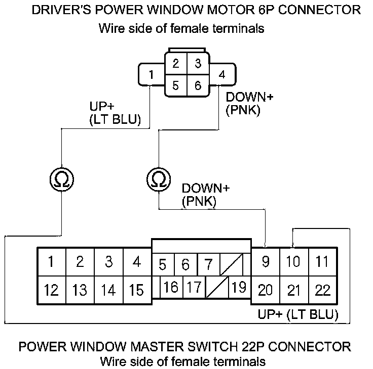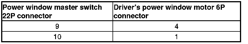 5. Check for continuity between the power window master switch 22P connector terminals and the driver's power window motor 6P connector terminals as shown. There should be continuity.