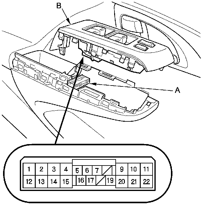 2. Disconnect the 22P connector (A) from the power window master switch (B).