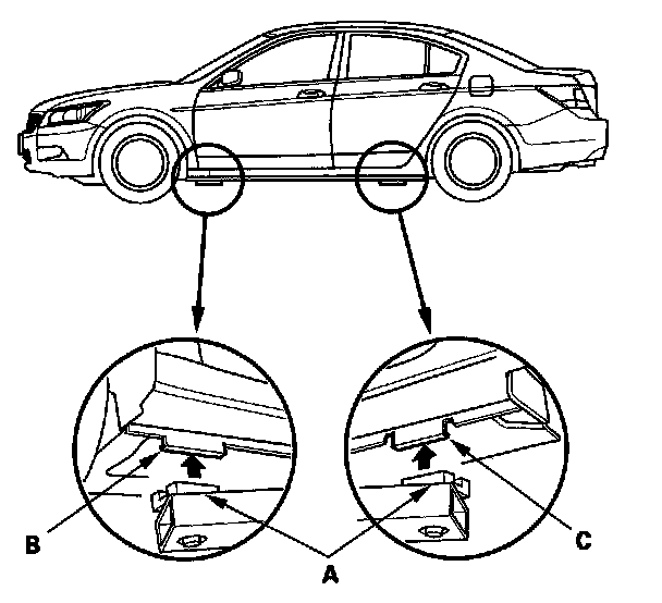 1. Position the hoist lift blocks (A) under the vehicle's front support points (B) and rear support points (C).