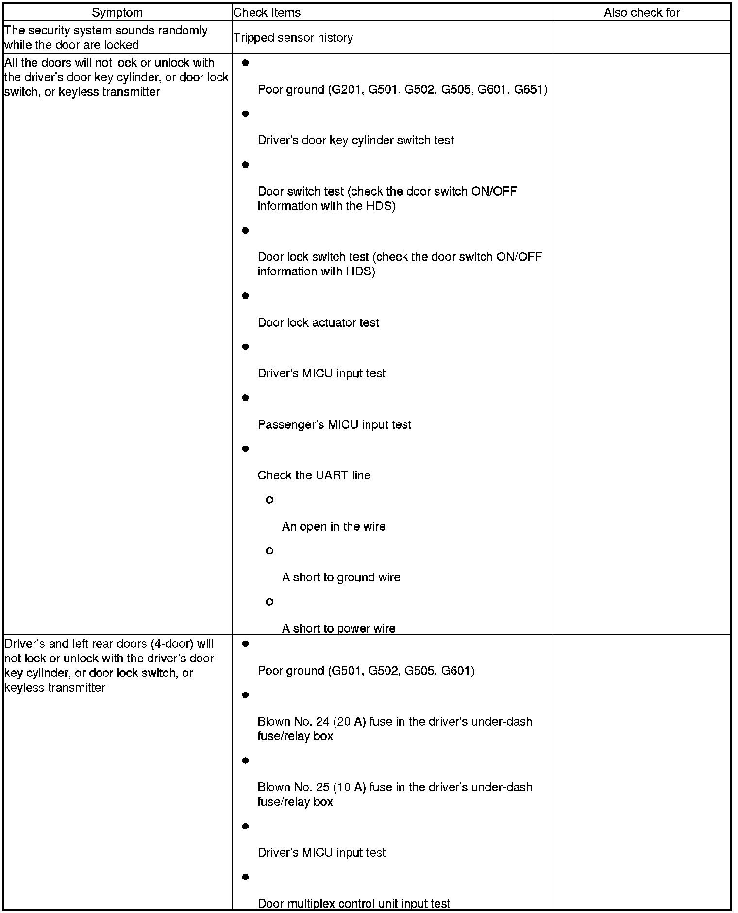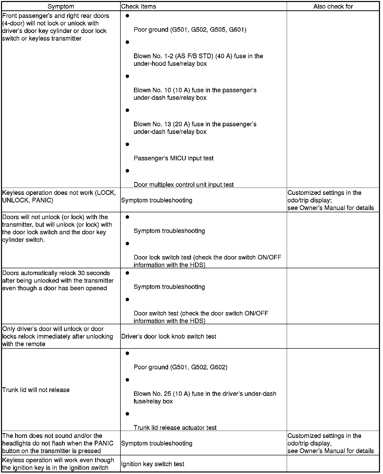 Keyless/Power Door Locks/Security System Symptom Troubleshooting Index