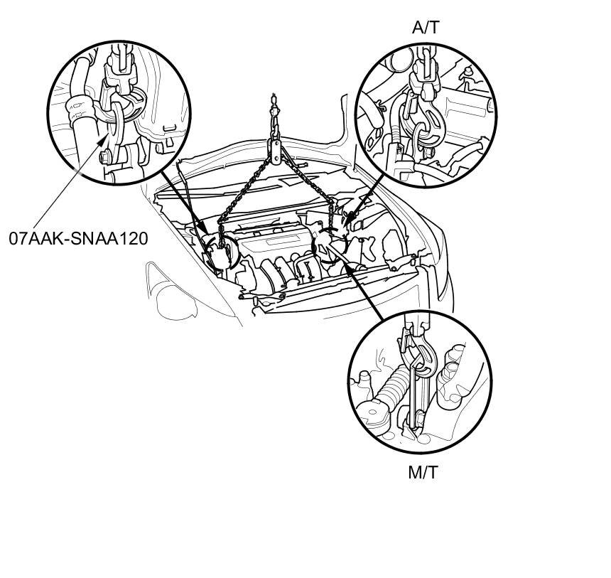 2. Raise the vehicle on the lift, and position the engine/ transmission under the vehicle. Lower the vehicle, and attach the universal lifting eyelet and the chain hoist to the universal lifting eyelet and the transmission hanger, then lift the engine into position in the vehicle.