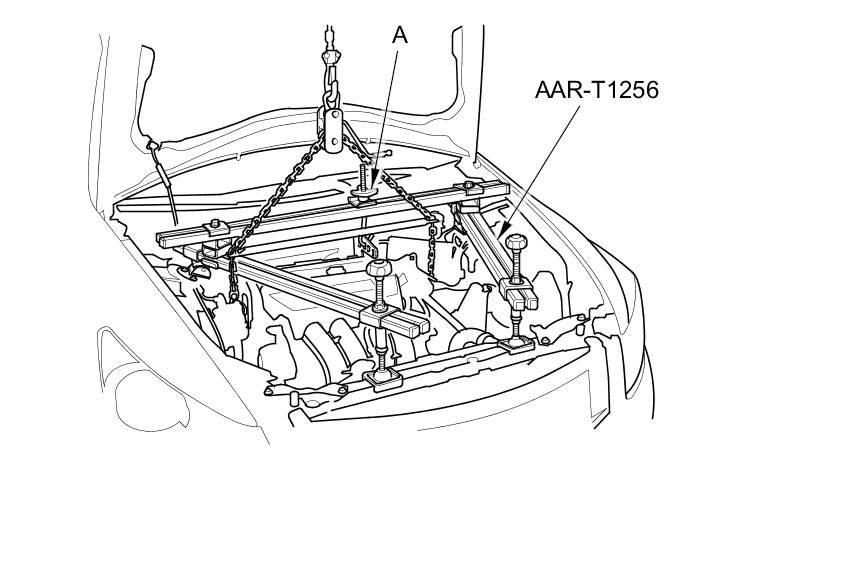 4. Install the engine support hanger (AAR-T1256) onto the vehicle as shown, and attach the hook to the slotted hole in the engine hanger adapter. Tighten the wing nut (A) by hand , and lift and support the engine/transmission.