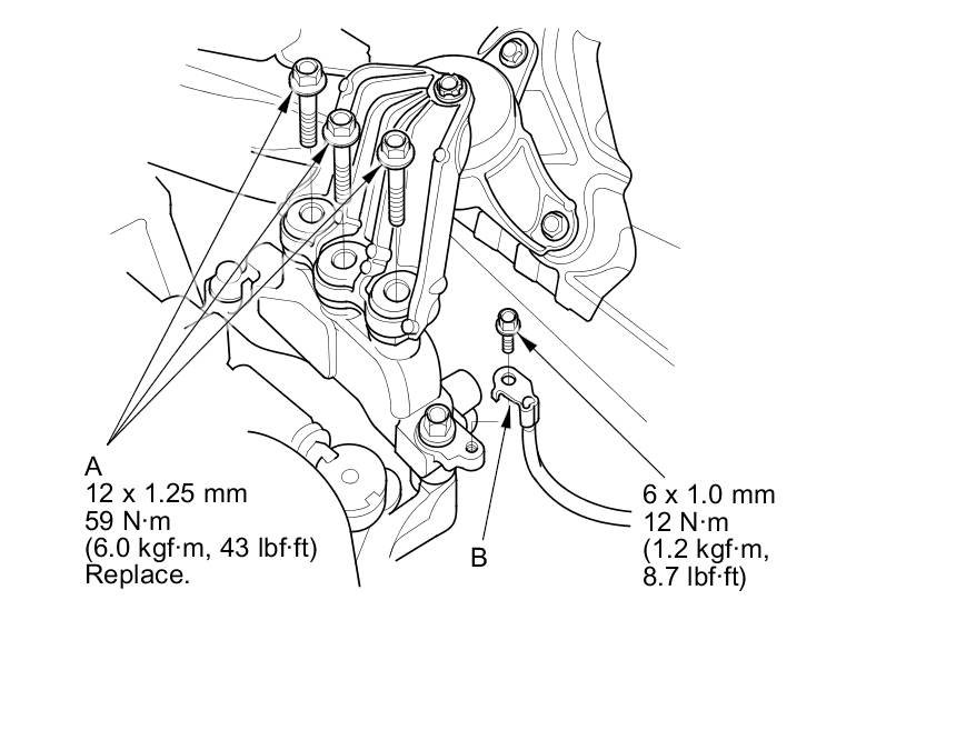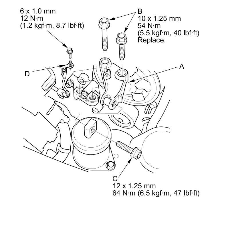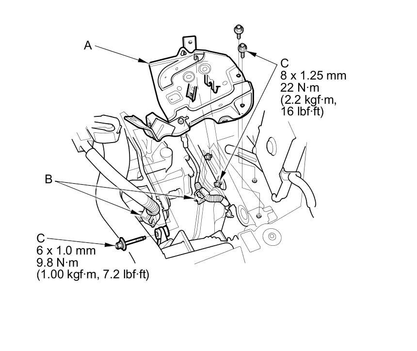 9. Install the side engine mount bracket (A), and tighten the new side engine mount bracket mounting bolts (B), then tighten the side engine mount mounting bolt (C).