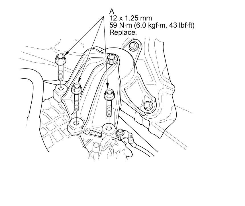 5. Tighten the new upper transmission mount bracket mounting bolts (A) to the specified torque.