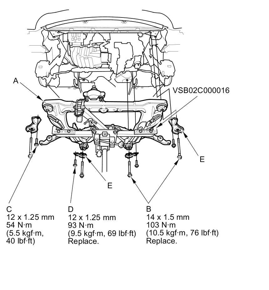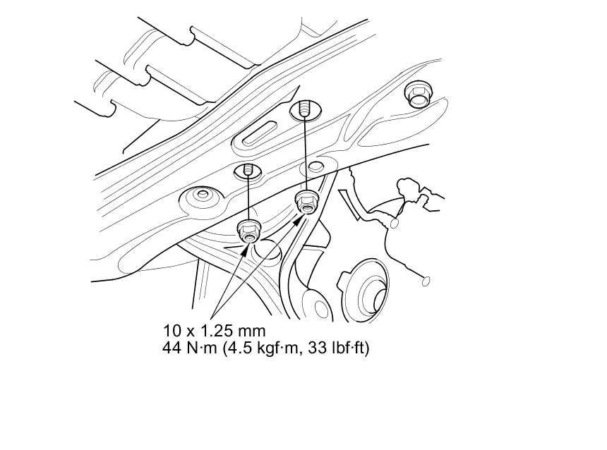 21. Tighten the front and rear subframe mounting bolts to the specified torque.