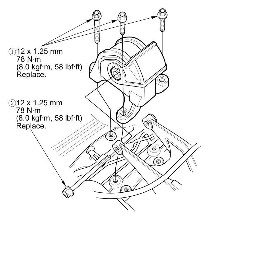 30. M/T: Remove the jack, then tighten the new rear engine mount mounting bolts in the numbered sequence shown.