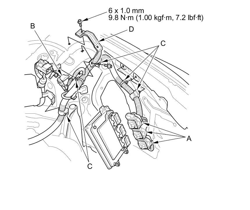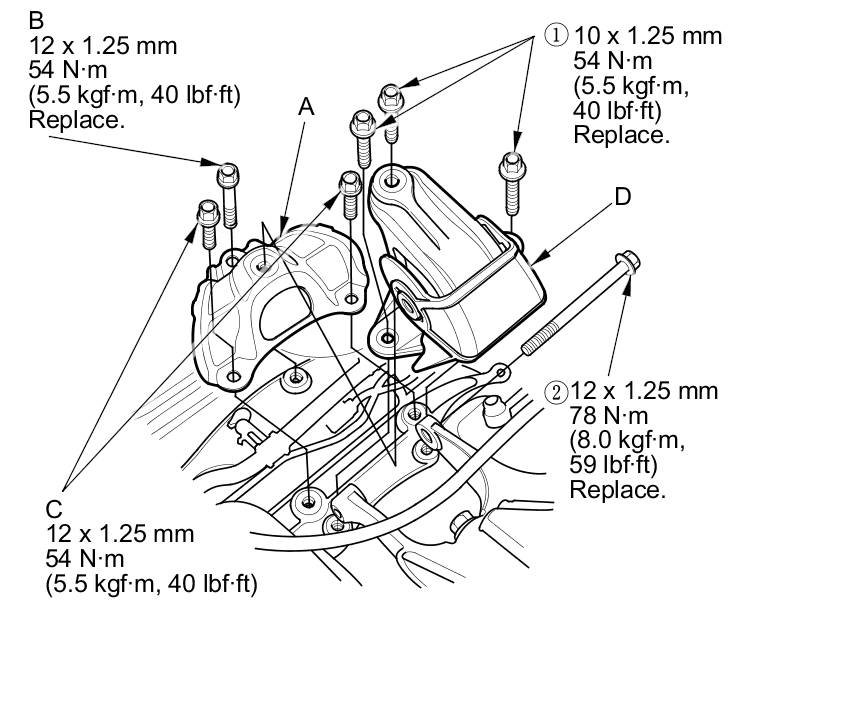 27. Tighten the new front engine mount mounting bolt (A), then install the front engine mount stop (B) using new nuts (C), and connect the vacuum hose (D).