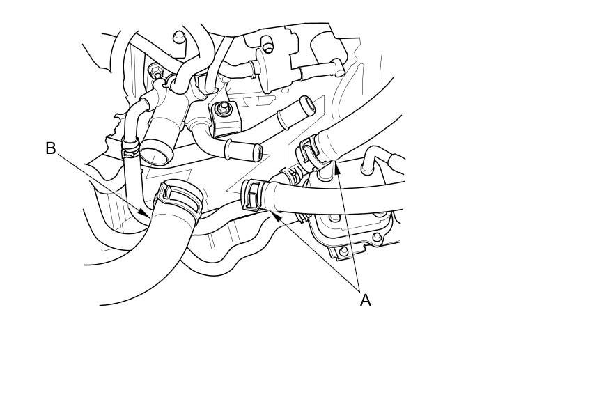 36. Connect the heater hoses (A) and the upper radiator hose (B).