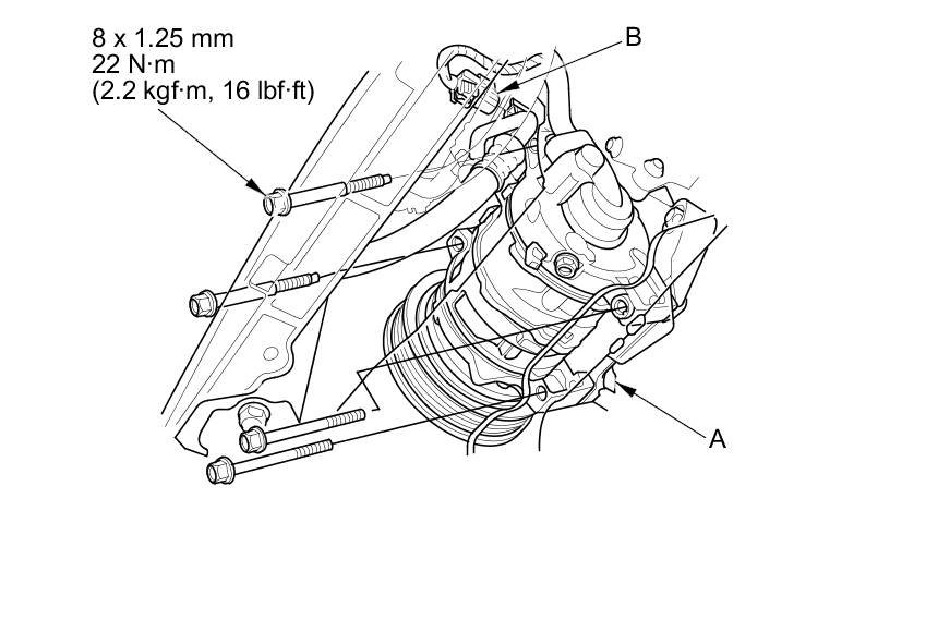 43. Install the A/C compressor (A), then connect the A/C compressor clutch connector (B).
