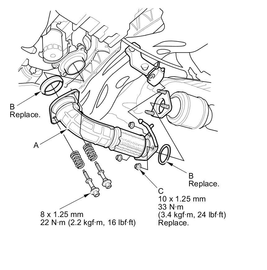 48. Install exhaust pipe A using new gaskets (B) and new self-locking nuts (C).