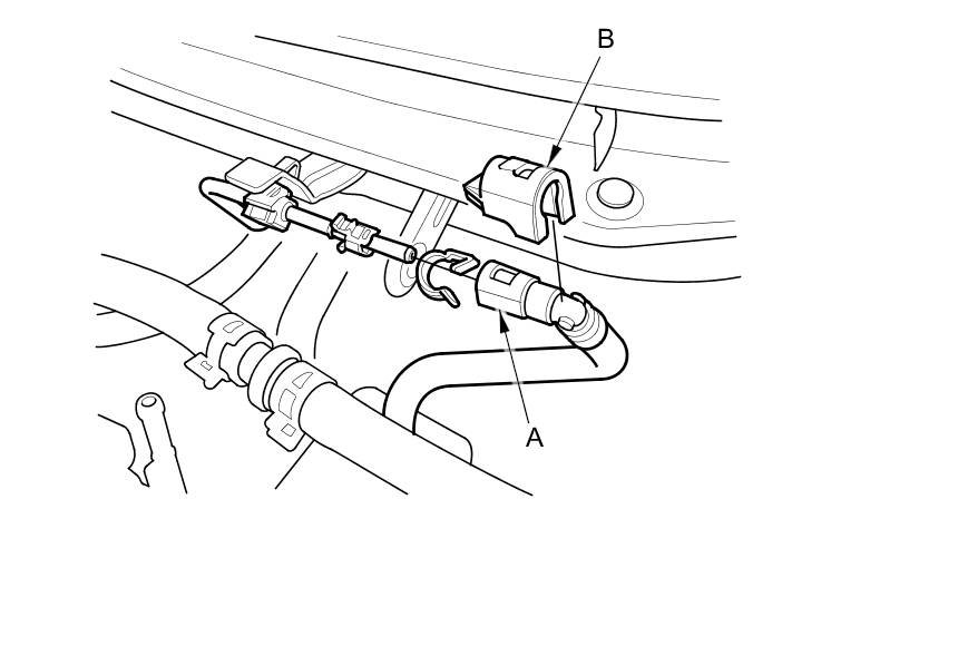 42. Install the power steering fluid line bracket (A), and clamp the power steering fluid line clamp (B) on the front subframe.